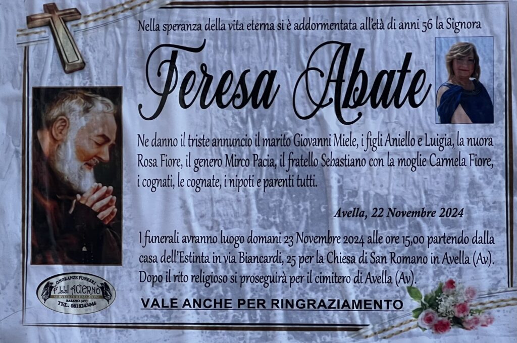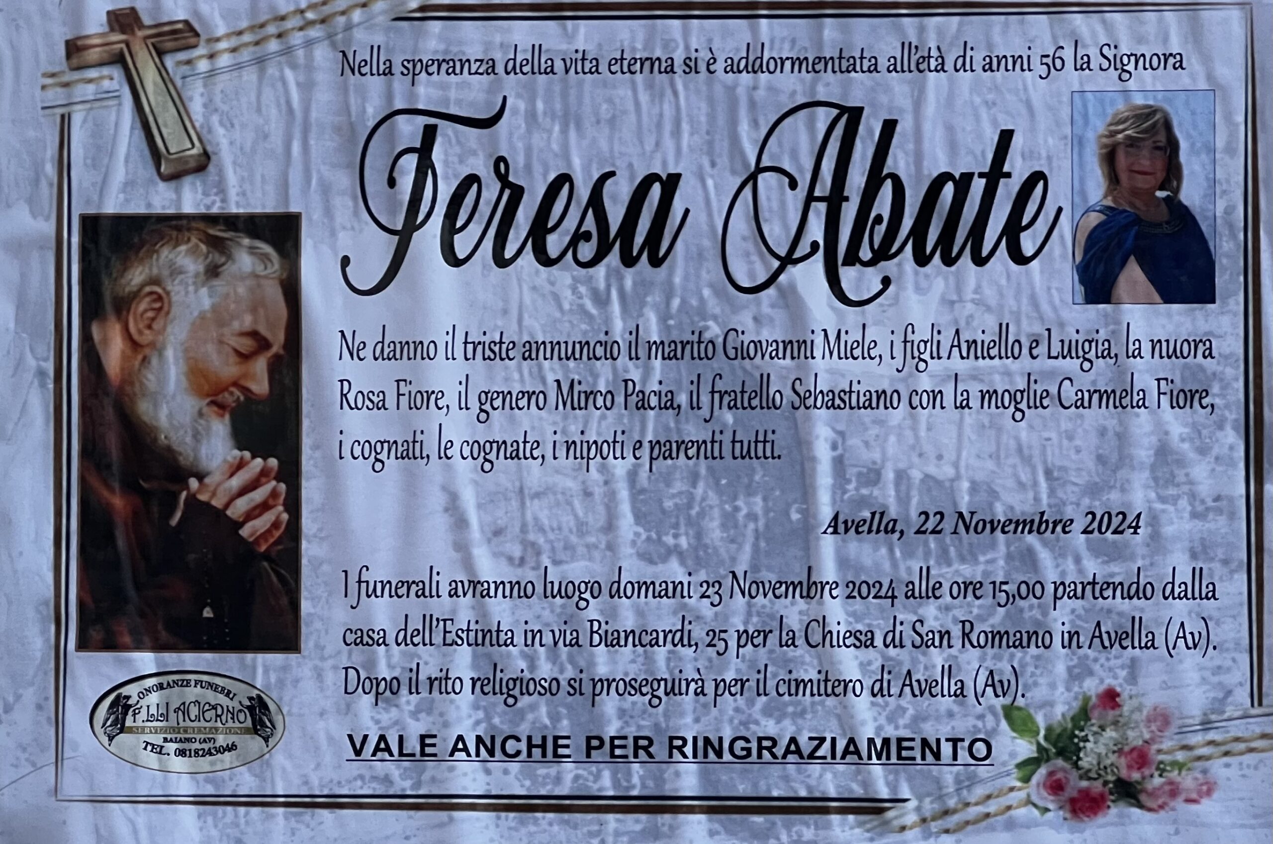 I funerali avranno luogo domani, 23 Novembre 2024, alle ore 15:00, partendo dalla casa dell’Estinta in via Biancardi, 25, per la Chiesa di San Romano in Avella (AV).