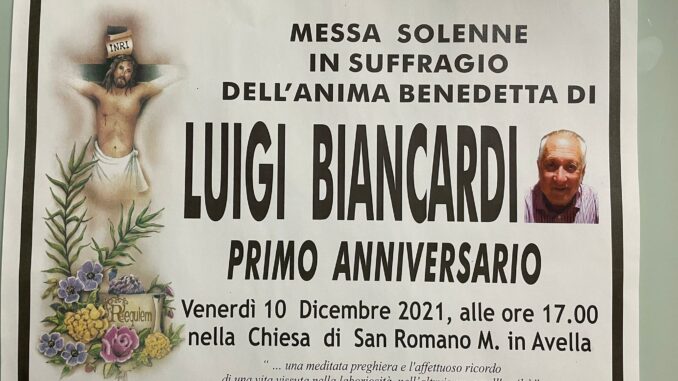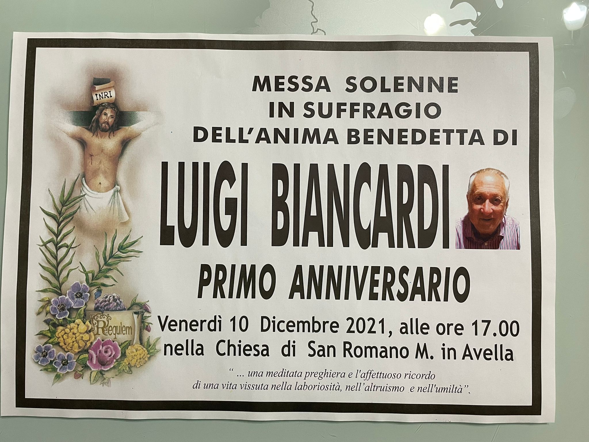 NON E’ PIU’. Avella, Primo Anniversario della scomparsa di Luigi Biancardi 09/12/2021 binews.it NON E' PIU' 0 Venerdì 10 dicembre alle ore 17 nella Chiesa di San Romano in Avella sarà celebrata una Messa Solenne in Suffragio dell’anima benedetta di Luigi Biancardi nel primo anniversario della morte.