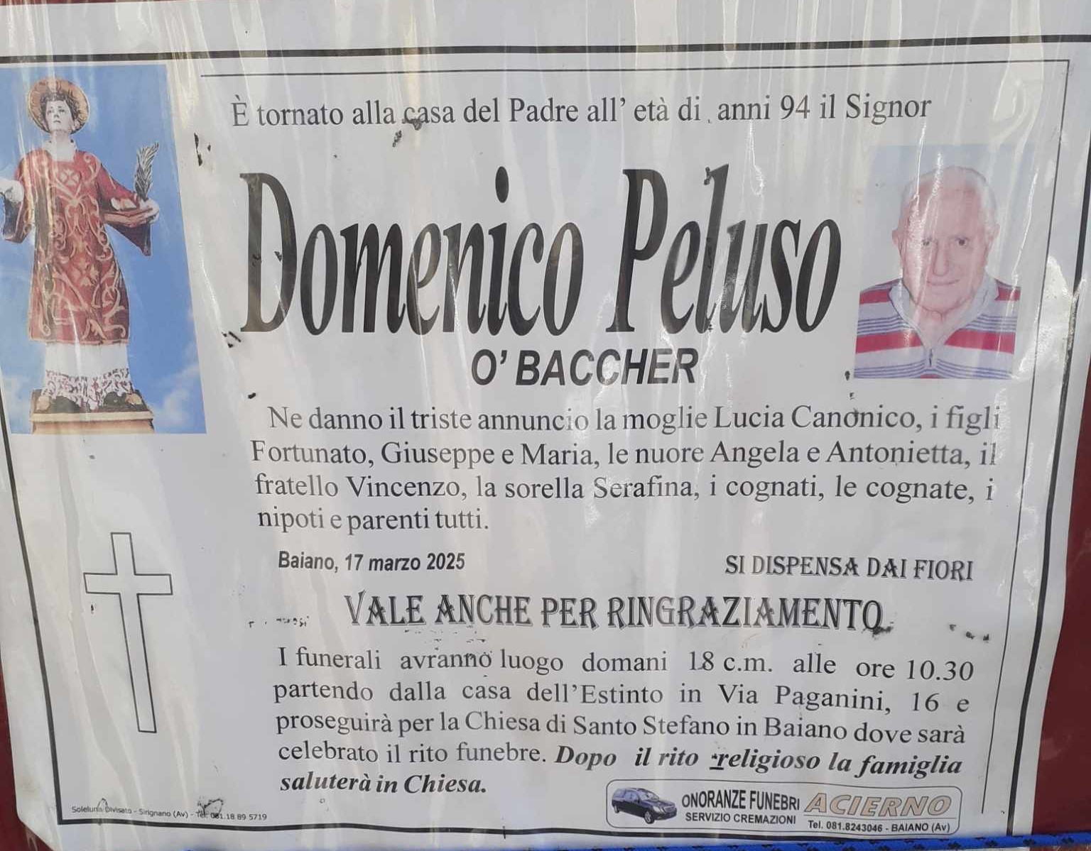 Baiano piange la scomparsa di Domenico Peluso, noto affettuosamente come “O’ Baccher”, che si è spento all’età di 94 anni. Uomo conosciuto e rispettato in paese, Domenico lascia un grande vuoto nei cuori di chi ha avuto la fortuna di conoscerlo.