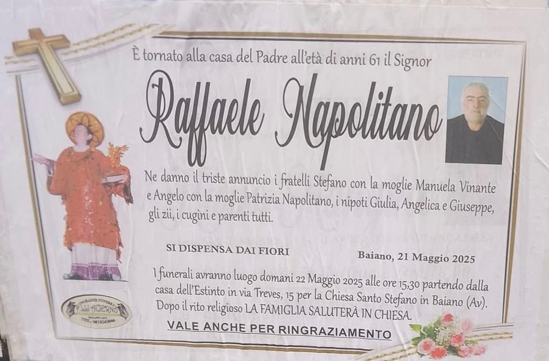 I funerali si terranno domani, 22 maggio 2025, alle ore 15:30, partendo dalla casa dell’estinto in via Treves 15, per la Chiesa Santo Stefano in Baiano (AV). Al termine del rito religioso, la famiglia saluterà in chiesa.