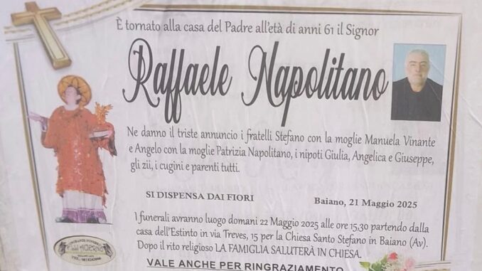 BAIANO – Si è spento all’età di 61 anni Raffaele Napolitano, molto conosciuto e stimato nella comunità locale. La notizia della sua scomparsa ha suscitato profonda commozione tra i familiari, gli amici e quanti lo conoscevano.