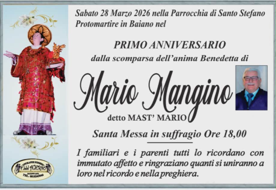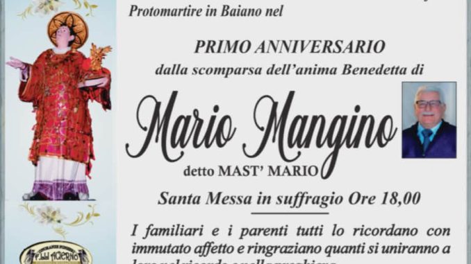 BAIANO – Un momento di raccoglimento e memoria per ricordare una figura cara alla comunità. Sabato 28 marzo 2026, presso la Parrocchia di Santo Stefano Protomartire di Baiano, sarà celebrato il primo anniversario dalla scomparsa di Mario Mangino, conosciuto da tutti come “Mast’ Mario”.