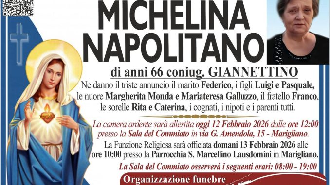 I funerali saranno celebrati domani, 13 febbraio 2026, alle ore 10:00 presso la Parrocchia San Marcellino Lausdomini in Marigliano.