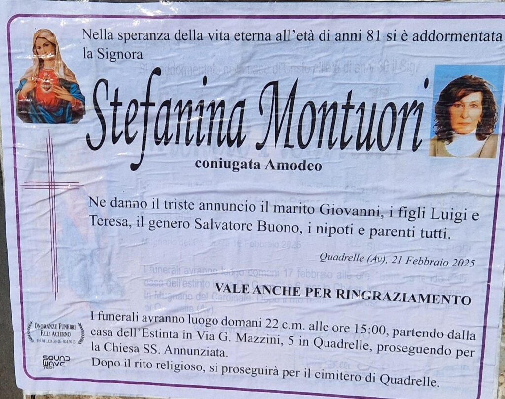 Quadrelle (AV) – La comunità di Quadrelle si stringe nel dolore per la scomparsa della signora Stefanina Montuori, coniugata Amodeo, che si è spenta all’età di 81 anni. A darne il triste annuncio sono il marito Giovanni, i figli Luigi e Teresa, il genero Salvatore Buono, i nipoti e i parenti tutti.