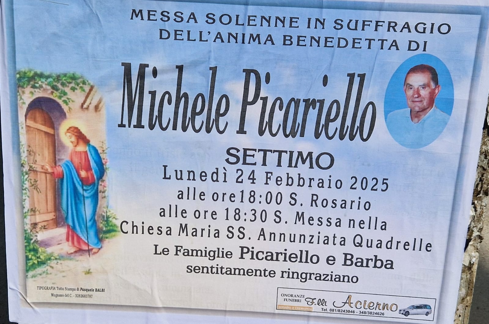 SETTIMO – Lunedì 24 febbraio 2025, nella Chiesa Maria SS. Annunziata di Quadrelle, si terrà una messa solenne in suffragio dell’anima benedetta di *Michele Picariello.