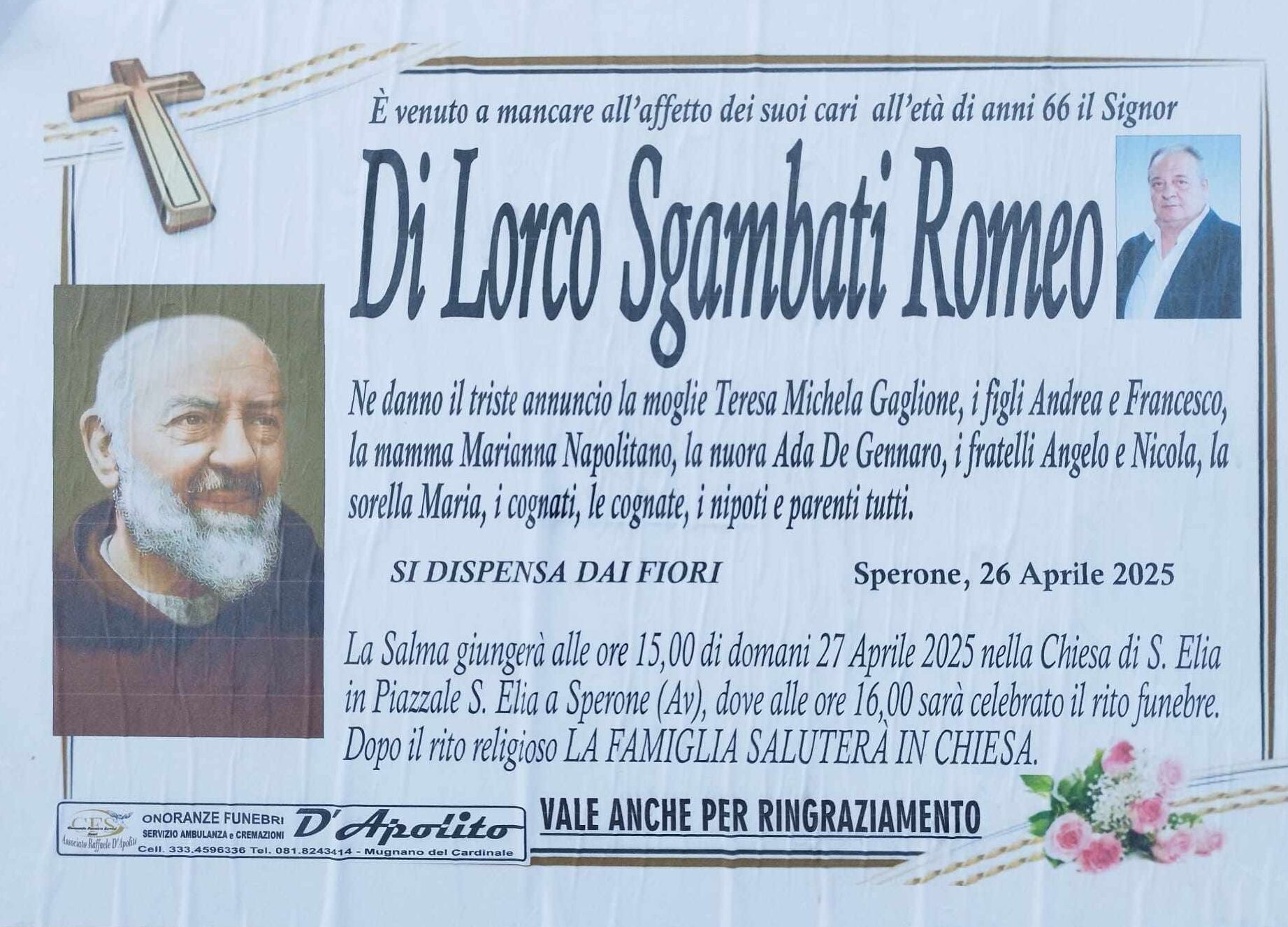 Il rito funebre si terrà domani, domenica 27 aprile 2025, nella chiesa di Sant’Elia in piazzale S. Elia a Sperone, dove alle ore 16:00 sarà celebrata la cerimonia religiosa. La salma giungerà in chiesa alle ore 15:00. Dopo la funzione, la famiglia saluterà il caro Romeo in chiesa.