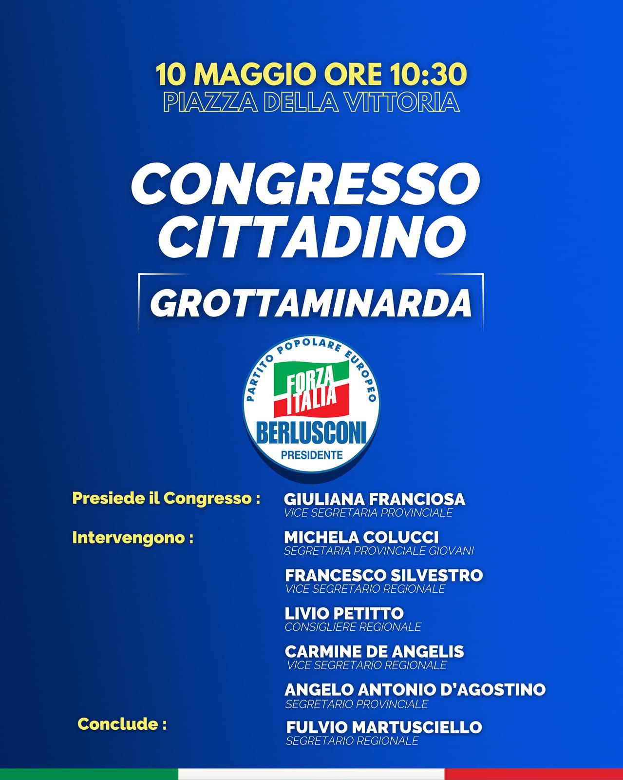 Si terrà sabato 10 maggio alle ore 10:30 in Piazza della Vittoria a Grottaminarda il Congresso Cittadino di Forza Italia, un appuntamento di grande rilevanza politica per l’intera Valle dell’Ufita. L’incontro rappresenta un’occasione per rilanciare l’azione del partito sul territorio, rafforzare il dialogo con i cittadini e definire le strategie in vista delle prossime sfide elettorali.