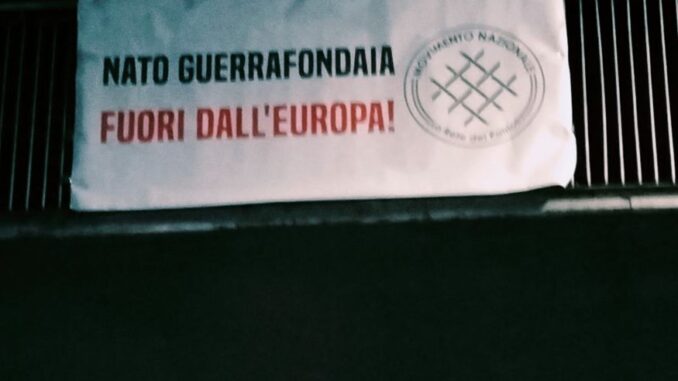 I militanti del Movimento Nazionale – La Rete dei Patrioti hanno affisso uno striscione per protestare contro l’atteggiamento bellicoso della Nato, che, pur di spodestare Putin, ha spinto l’Europa in un nuovo conflitto, esacerbando la tensione al confine russo, per tramite del presidente Ucraino Zelensky, manovrato dagli Stati Uniti.