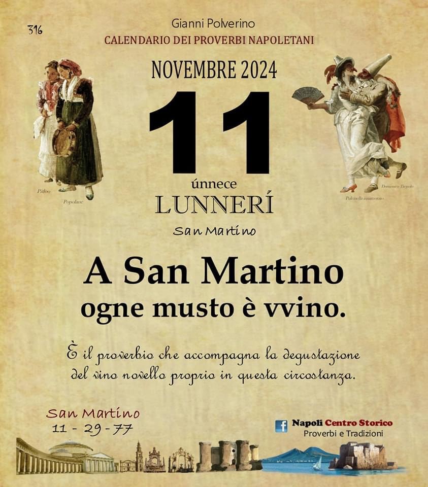 È il proverbio che accompagna la degustazione del vino novello proprio in questa circostanza.O PRUVERBIO D O JUORNO. Lunedì 11 novembre 2024