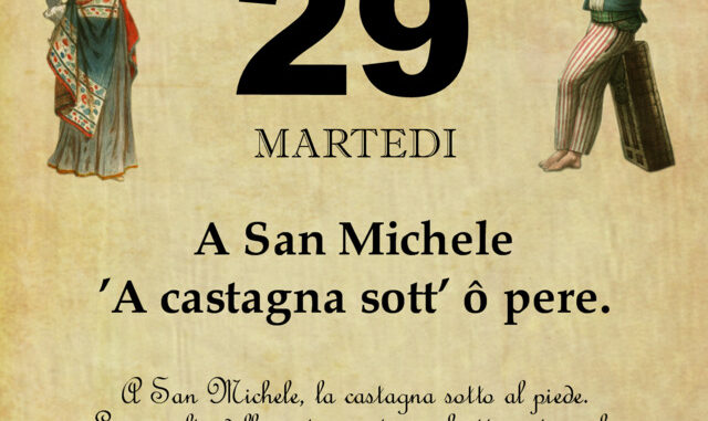 ‘O PRUVERBIO D’ ‘O JUORNO. Martedì 29 settembre 2020 29/09/2020 binews.it EVIDENZA, Il Proverbio del Giorno 0 di Gianni Polverino A San Michele ’A castagna sott’ ô pere. A San Michele, la castagna sotto al piede. La raccolta delle castagne, tipico frutto autunnale, inizia alla fine di settembre.