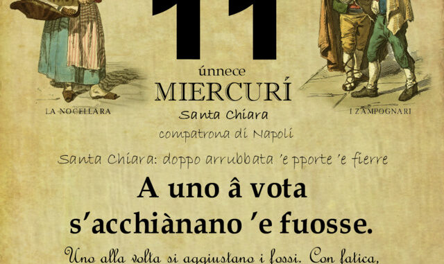 Uno alla volta si aggiustano i fossi. Con fatica, pazienza e perseveranza si superano tutte le difficoltà. “Santa Chiara: doppo arrubbata ’e pporte ’e fierre” spesso si corre ai ripari quando ormai è troppo tardi e il danno si è già verificato.