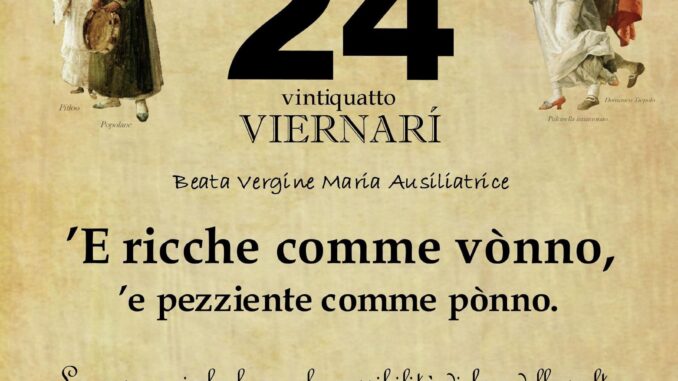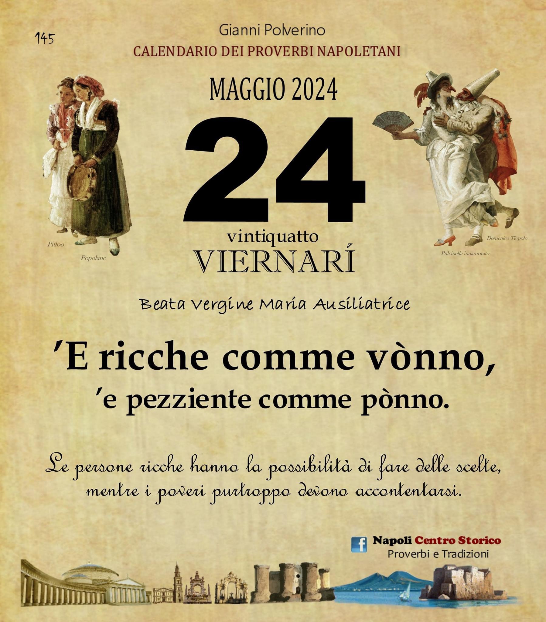 ‘O PRUVERBIO D’ ‘O JUORNO. Venerdì 24 maggio 2024 24/05/2024 binews.it EVIDENZA, Il Proverbio del Giorno 0 di Gianni Polverino ’E ricche comme vònno, ’e pezziente comme pònno. Le persone ricche hanno la possibilità di fare delle scelte, mentre i poveri purtroppo devono accontentarsi.