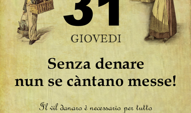 ‘O PRUVERBIO D’ ‘O JUORNO. Giovedi 31 maggio 2018 31/05/2018 binews.it Il Proverbio del Giorno 0 di Gianni Polverino Senza denare nun se càntano messe! Il vil danaro è necessario per tutto anche per le funzioni religiose.