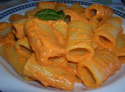 Lavate i peperoni, fateli a listarelle e cuoceteli con olio, sale e e basilico; quando sono cotti passateli con il mixer ad immersione. Cuocete la pasta e intanto aggiungete la ricotta alla crema di peperoni e mescolate bene. Quando la pasta è cotta rovesciatela in un vassoio con un pò di crema di peperoni e ricotta e finite di condire oppure, se non vi sembra abbastanza ritirata, ripassatela qualche attimo sul fuoco. Impiattate e servite!
