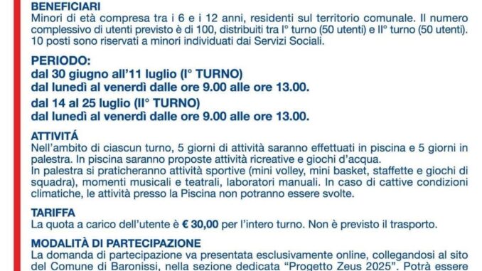 Aperte ufficialmente le iscrizioni al Progetto ZEUS Estate 2025, il programma estivo promosso dal Comune di Baronissi e rivolto alle bambine e ai bambini residenti tra i 6 e i 12 anni. Un’occasione di crescita, svago e socializzazione pensata per accompagnare i più piccoli durante il mese di luglio.