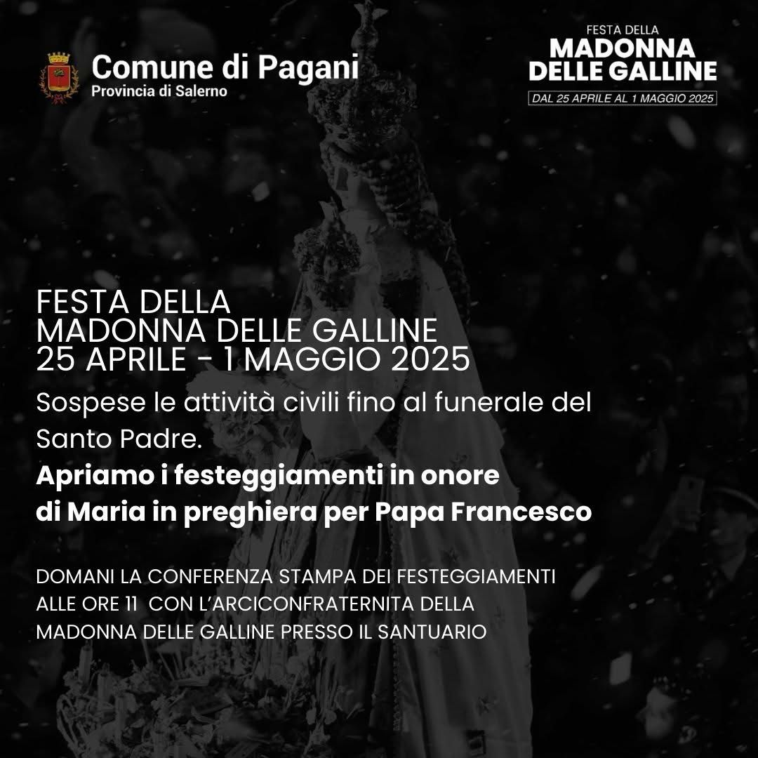 In segno di rispetto per la scomparsa di Papa Francesco, l’edizione 2025 dei festeggiamenti in onore della Madonna del Carmelo, detta “delle Galline”, si aprirà con un forte spirito di raccoglimento e preghiera. Il lutto che ha colpito l’intera comunità cristiana ha portato gli organizzatori a sospendere temporaneamente tutte le attività del programma civile previste fino al termine delle esequie del Santo Padre.