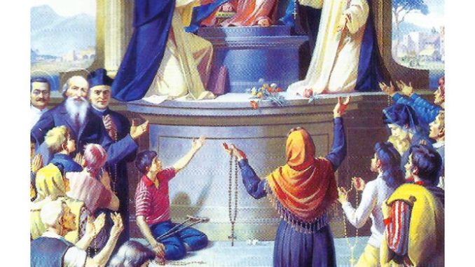 Oggi 7 ottobre la chiesa celebra la Beata Vergine Maria del Rosario, l’origine della Madonna del Rosario è stata attribuita a san Domenico di Guzman, nel 1212 a Prouille, nel primo convento da lui fondato, vide la Vergine Maria che gli consegnò il Rosario, come risposta ad una sua preghiera, a Lei rivolta, per sapere come combattere l’eresia albigese. Fu così che il Santo Rosario divenne l’orazione più diffusa per contrastare le eresie e fu l’arma determinante per vincere i musulmani a Lepanto. La Chiesa cattolica celebra la festa della Madonna del Rosario il 7 ottobre di ogni anno. Questa festa fu istituita con il nome di “Madonna della Vittoria” dal papa Pio V a perenne ricordo della battaglia di Lepanto,