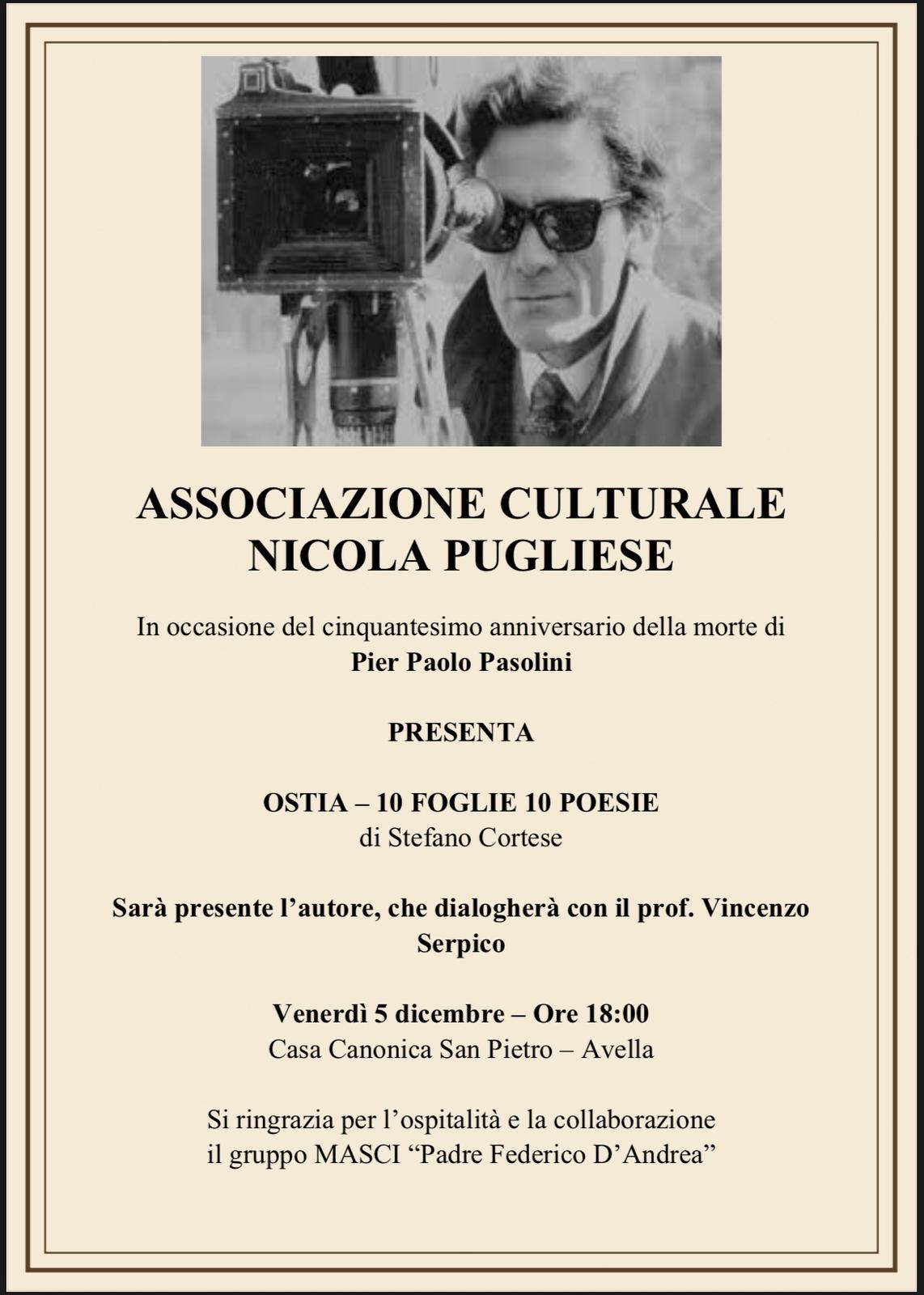 Ad Avella un pomeriggio dedicato a Pier Paolo Pasolini: l’Associazione Culturale “Nicola Pugliese” presenta Ostia – 10 foglie 10 poesie