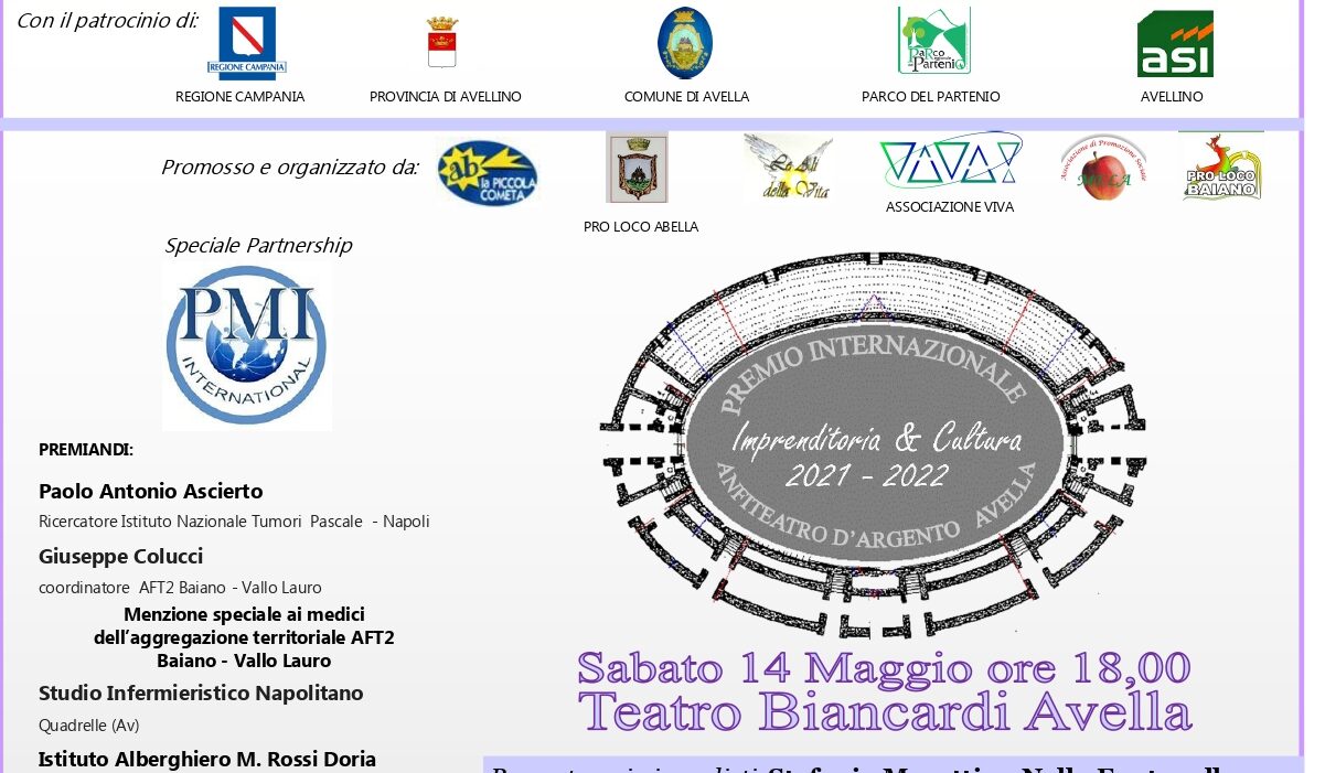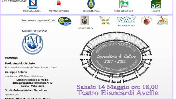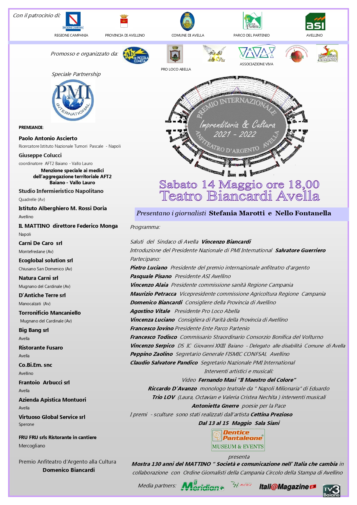 Imprenditoria & Cultura vivrà il momento-clou, sabato –  14 maggio, alle ore 18,00– nell’accogliente e sobria  location del Teatro comunale Biancardi, con la cerimonia del conferimento dei testimonial dell’Anfiteatro d’Argento, con la presentazione curata da Stefania Marotti e Nello Fontanella, giornalisti  de Il Mattino, con l’indirizzo di saluto e gli onori di ospitalità che saranno resi dal sindaco della città, Vincenzo Biancardi, e l’introduzione del presidente nazionale di PMI International, Salvatore Guerriero.