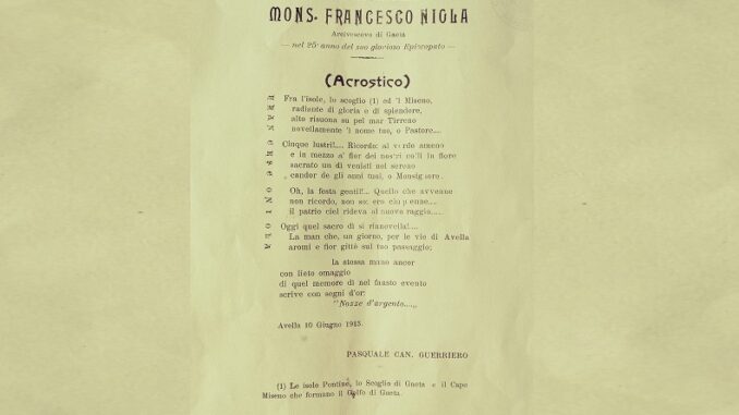 Comunque il popolo avellano, da parte sua, fu orgoglioso e fiero di avere un figlio così illustre e, infatti, nel venticinquesimo anno del suo glorioso Episcopato, lo scrittore e poeta Mons. Pasquale Guerriero, all’epoca solo canonico, gli dedica un acrostico dal titolo “ ALL’ILLUSTRE Avellano Mons. Francesco Niola, Arcivescovo di Gaeta”, edito dalla tipografia Ferrara di Avella e datato 10 giugno 1913, cosi scrisse: