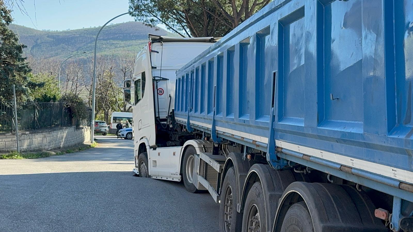 Questo pomeriggio in via Giacomo Leopardi, intorno alle 14:30 un tir è rimasto bloccato sulla carreggiata a causa del cedimento del manto stradale. Il mezzo pesante, mentre transitava, ha visto la sua ruota anteriore sinistra sprofondare improvvisamente, rendendo impossibile la prosecuzione della marcia.
