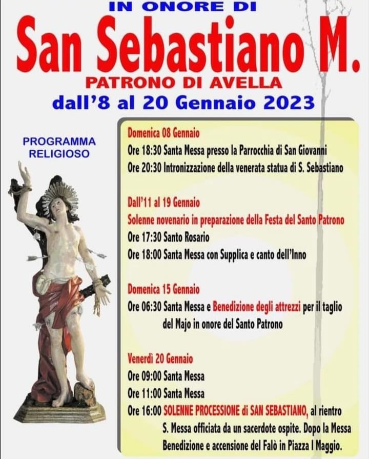 Dopo due anni di stop, causa pandemia da Covid, ritorna anche ad Avella la tradizionale sfilata del Majo in onore di San Sebastiano, patrono della cittadina archeologica che si festeggia il 20 gennaio. Come da tradizione il Maio viene tagliato la domenica che precede il 20 gennaio, quest’anno domenica 15 gennaio 2023, quando di buon ora i partecipanti al rito si riuniranno in piazza I Maggio, tra breve piazza San Sebastiano, dove dopo la Santa Messa delle prime luci dell’alba, 6,30, il parroco don Giuseppe Parisi in piazza benedirà partecipanti, attrezzi e mezzi che serviranno per il taglio dell’alto fusto, pronti a recarsi in montagna per le operazioni. Il taglio sarà un momento principale della giornata di festa, forse il più importante ed emozionante, dopo però quella che è l’operazione di alzata dell’alto fusto nella piazza antistante la Chiesa di San Giovanni, che rappresenta il culmine della giornata. Dopo aver effettuato l’abbattimento dell’albero scelto, il gruppo scenderà più a valle, dove sosterà per banchettare e rifocillarsi. Nel primo pomeriggio la discesa in paese, con il popolo ad attendere i protagonisti in località “Mulini” e da qui la sfilata verso la piazza San Giovanni, accompagnata da musica, balli e divertimento. Un appuntamento con la tradizione da non perdere.