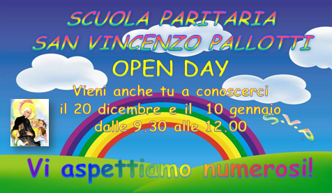 Mercoledì 20 dicembre e 10 gennaio la Scuola Paritaria San Vincenzo Pallotti aprirà le porte a tutti per presentare l’offerta didattica con visite ai laboratori,accoglienza e animazione per i bambini. Un momento di condivisione ed informazione importante. L’Open Day si svolgerà nella mattinata dalle 9.00 alle 12.00, i bambini e le loro esigenze saranno al centro dell’attenzione di genitori ed insegnanti. Ad organizzare questa giornata il collegio insegnanti della Scuola dell’Infanzia e Primaria , la coordinatrice didattica Suor Beniamina Tropiano che ha ben accolto l’iniziativa, tutte le suore, i genitori e le collaboratrici. Per l’occasione gli alunni dell’Istituto hanno realizzato un video-spot.