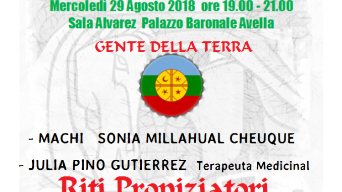 Mapuche, in lingua tradizionale vuol dire  “Gente della Terra”, popolo originario che abita il sud del Cile e Argentina, protettori della Patagonia. Unici indigeni i cui territori sono stati riconosciuti dai conquistatori europei come “nazione” proprio per non essere mai riusciti a conquistarli e che ad oggi conservano le loro tradizioni e i loro costumi millenari. La Machi Sonia Millahual Cheuque e la Terapeuta medicinal Julia Pino Gutierrez  saranno ad Avella mercoledì tra le 19.00 e le 21.00 presso la Sala Alvarez del Palazzo Baronale con le loro cerimonie ancestrali, riti propiziatori, terapie, medicina naturale. Per info Sussy Varela Brandt cell. 3292065493.