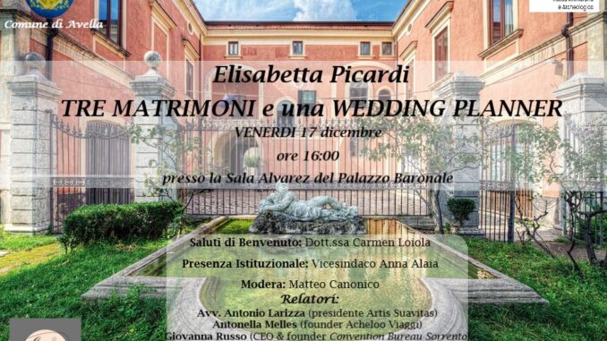 In occasione dell’evento Nativitatis,organizzato dal Comune di Avella il giorno 17 dicembre alle ore 16.00 presso la Sala Alvarez del Palazzo Baronale, ci sarà la presentazione del libro “Tre Matrimoni e una Wedding Planner”.A fare gli onori di casa la Dott.ssa Carmen Loiola e la vice-sindaca Dott.ssa Anna Alaia, a moderare la presentazione Matteo Canonico, tra i relatori Antonio Larizza (Presidente Artis Suavitas), Antonella Melles (founder Acheloo Viaggi), Giovanna Russo (CEO & Founder Convention Bureau Sorrento), interverranno inoltre la Dott.ssa Ilaria Polito e Marialuisa Rapuano protagoniste del libro.
