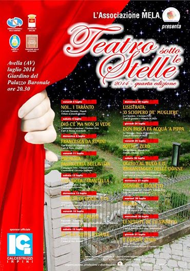 AVELLA. Tutto pronto per il secondo weekend teatrale dell’associazione “Mela”. 11/07/2014 binews.it ATTUALITA', AVELLA, CULTURA e MANIFESTAZIONI 0 Per questa sera, Venerdì 11 LUGLIO, a partire dalle ore 21,00 nell’ambito della manifestazione teatrale organizzata dall’associazione “Mela”, La Compagnia “Totò” presenta: “PREMIATA PASTICCERIA BELLAVISTA”.