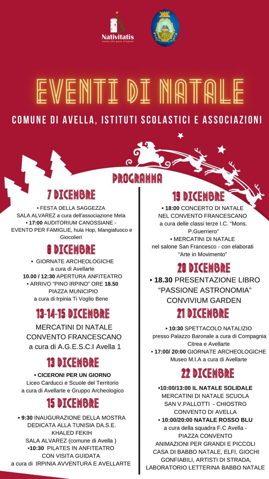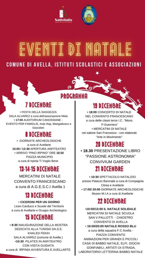 – Dalle 10:00 alle 20:00, l’evento Natale Rosso Blu, a cura della squadra F.C. Avella, si terrà in Piazza Convento. Animazioni per grandi e piccoli, casa di Babbo Natale, elfi, giochi gonfiabili, artisti di strada e laboratori arricchiranno la giornata.