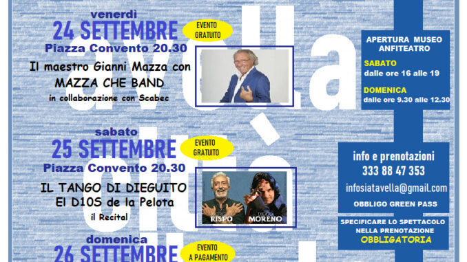 In occasione delle giornate europee del patrimonio, il 25 e 26 settembre, il sindaco del Comune di Avella Domenico Biancardi e la consigliera delegata al turismo Carmen Loiola in collaborazione con il Ministero della Cultura hanno programmato l’apertura straordinaria del Parco Archeologico dell’Anfiteatro e del Museo Archeologico ed Immersivo MIA . Il programma prevede l’ingresso, su prenotazione, per le visite sabato dalle ore 16.00 alle 19.00 e domenica dalle ore 9.30 alle ore 12.30. Alle aperture programmate si aggiungono altri tre imperdibili appuntamenti: venerdì 24 settembre, nella centralissima Piazza Convento si esibirà il maestro Gianni Mazza con “Mazza che band”, evento gratuito organizzato in collaborazione con Scabec. Sabato 25 settembre, sempre in piazza altro evento gratuito, spazio al tango e alla recitazione con la prima assoluta delle spettacolo dedicato a Diego Armando Maradona ,“Il tango di Dieguito” El D10S de la Pelota, un recital con Patrizio Rispo e Diego Moreno, accompagnati da 5 musicisti e 2 ballerini argentini. Si chiude il calendario degli eventi di fine estate nell’Anfiteatro Romano che ospiterà la compagnia teatrale M&N’S e “Il Demiurgo” con la partecipazione straordinaria di Rosaria De Cicco per lo spettacolo-viaggio tra le epoche “Itinera-Tour” (evento a pagamento) . Sarà obbligatoria l’esibizione del Green Pass e la prenotazione sia per le visite ai monumenti o alle aree museali, sia per la partecipazione agli spettacoli.