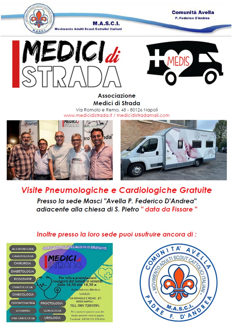 Con questa iniziativa, la Comunità M.A.S.C. I. ” Avella P. Federico D’Andrea “conferma il proprio impegno nel promuovere valori di solidarietà e attenzione verso il prossimo, in linea con i principi dello scoutismo cattolico.La Comunità M.A.S.C. I.  Avella P. Federico DAndrea  ospita l’Associazione Medici di Strada. La Comunità M.A.S.C. I.  Avella P. Federico DAndrea  ospita l’Associazione Medici di Strada.