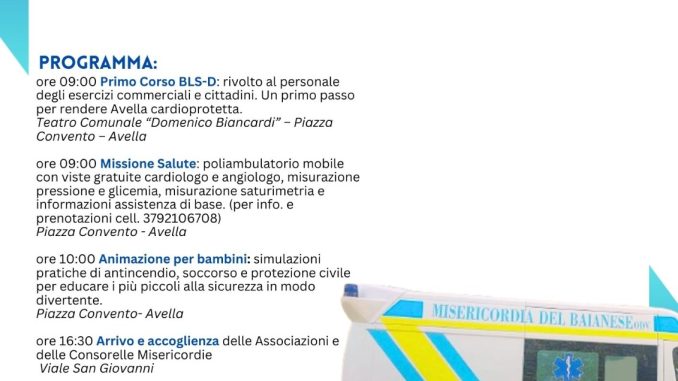 Alle 10:00 si terranno attività educative per bambini, con simulazioni di protezione civile, soccorso e antincendio. Alle 16:30 arriveranno le Associazioni consorelle, in Viale San Giovanni, per partecipare alla manifestazione. La Santa Messa delle 17:30, celebrata presso la Collegiata di San Giovanni Battista, sarà seguita dalla benedizione della nuova ambulanza e dalla sfilata dei mezzi per le vie del paese.