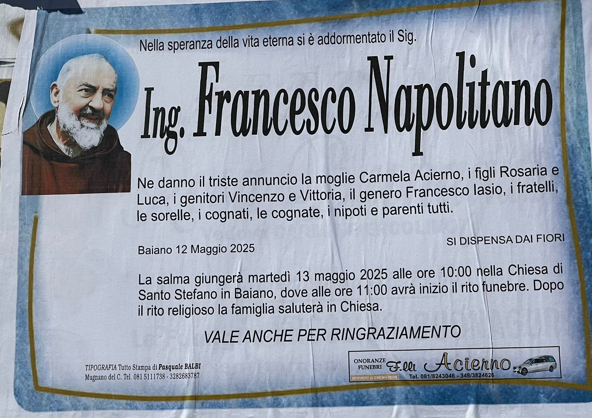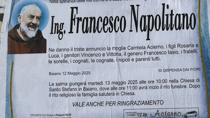 Baiano – Un lutto profondo colpisce le comunità di Baiano e Avella per la scomparsa dell’ingegnere Francesco Napolitano, spentosi il 12 maggio 2025. La triste notizia è stata annunciata dalla moglie Carmela Acierno, dai figli Rosaria e Luca, dai genitori Vincenzo e Vittoria, dal genero Francesco Iasio, dai fratelli, sorelle, cognati, cognate, nipoti e parenti tutti.