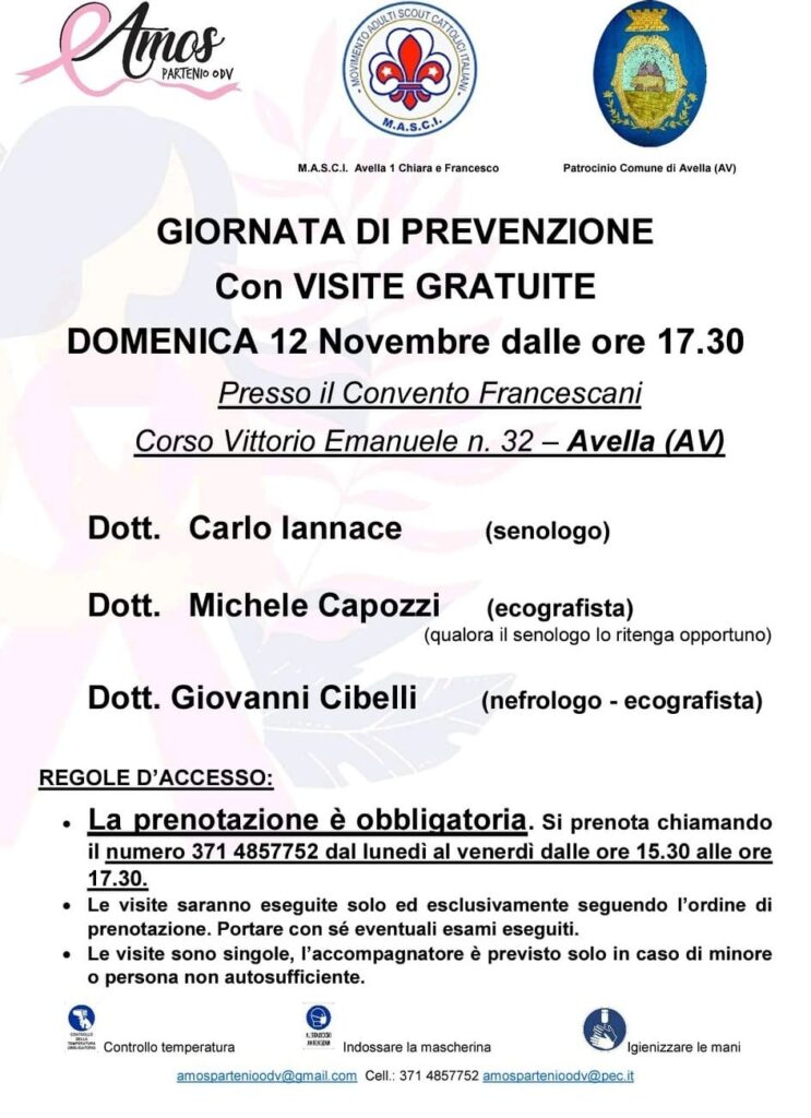 L’associazione Amos Partenio, in collaborazione con il gruppo Masci e il Comune di Avella, sta promuovendo un importante appuntamento dedicato alla prevenzione della salute. Domenica 12 novembre 2023, a partire dalle ore 17:30, presso il Convento Francescano, i cittadini avranno l’opportunità di sottoporsi gratuitamente a controlli medici con specialisti altamente qualificati.
