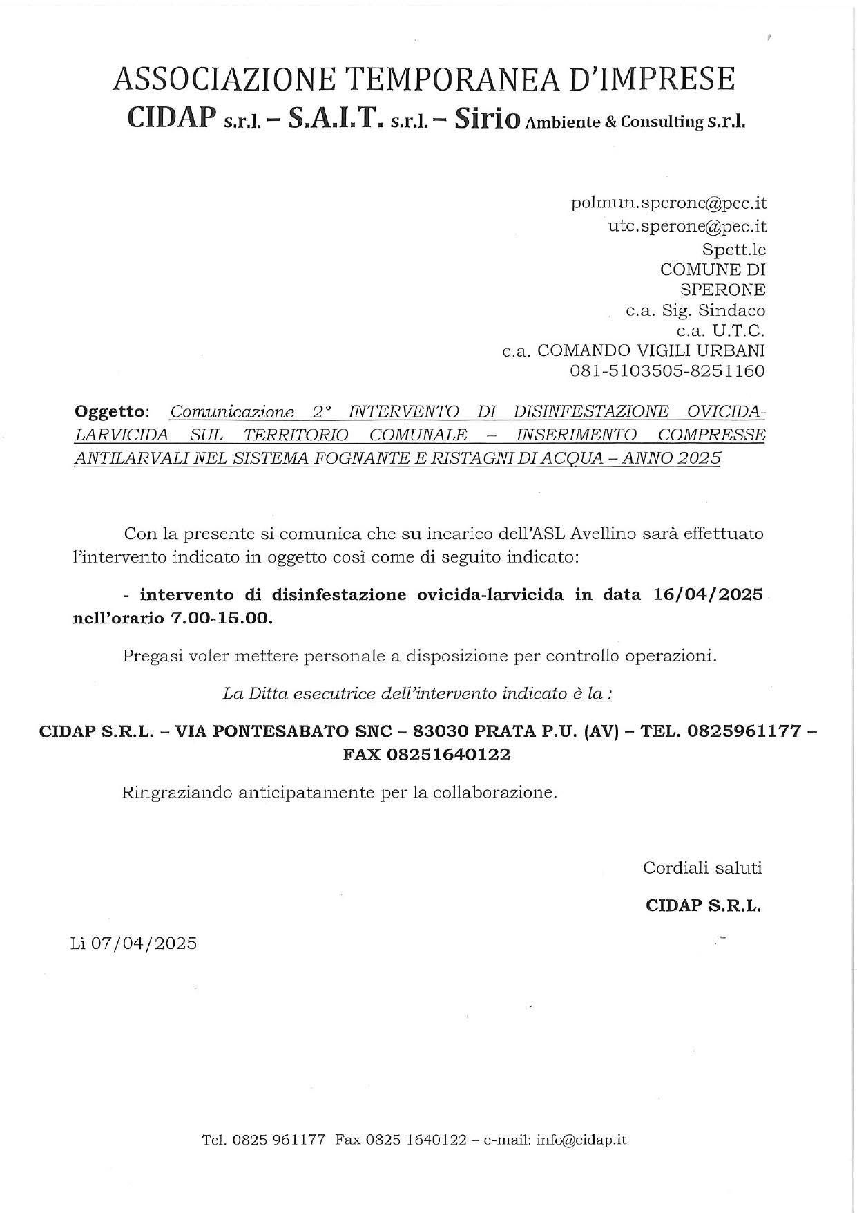 Il Comune di Sperone informa la cittadinanza che mercoledì 16 aprile 2025, nella fascia oraria compresa tra le 7:00 e le 15:00, sarà effettuato un intervento straordinario di disinfestazione adulticida su tutto il territorio comunale.