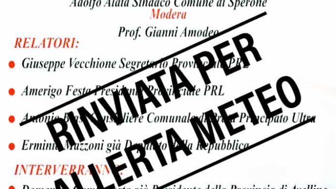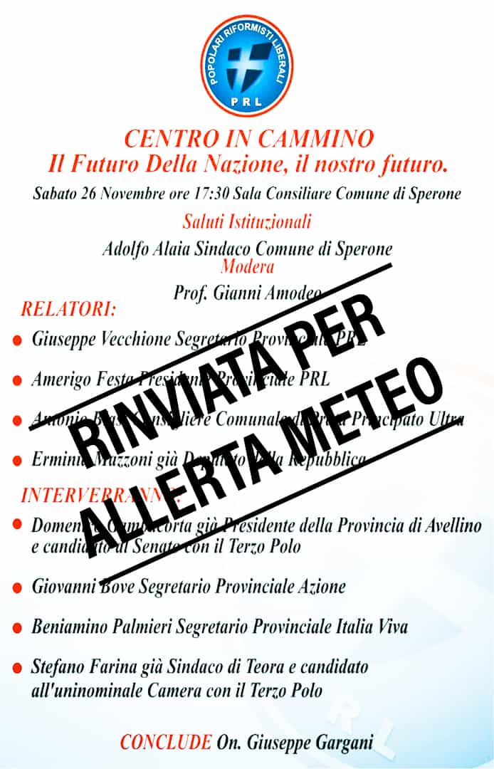 Il dibattito in programma oggi, sabato 26 Novembre presso la sala Consiliare del Comune di Sperone, alle ore 17.30, su iniziativa politica organizzata dal gruppo dei “Popolari, riformisti e Liberali” dal nome “Centro in cammino. Il futuro della Nazione, il nostro futuro”, è stato rinviato per le avverse condizioni meteo. Sarà a cura degli organizzatori comunicare la prossima data.