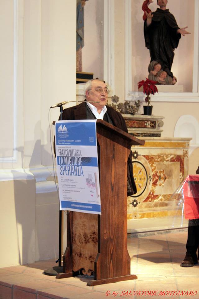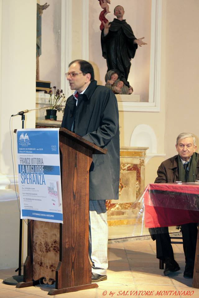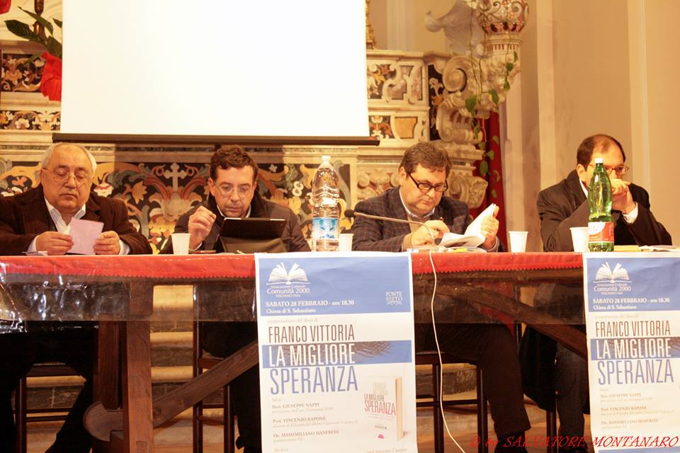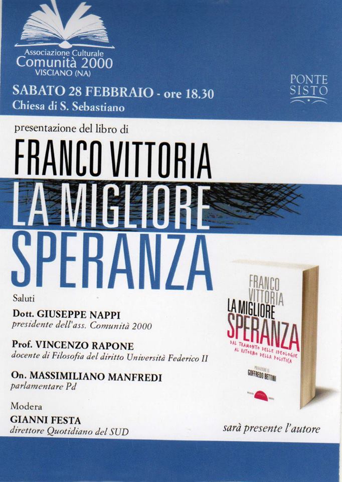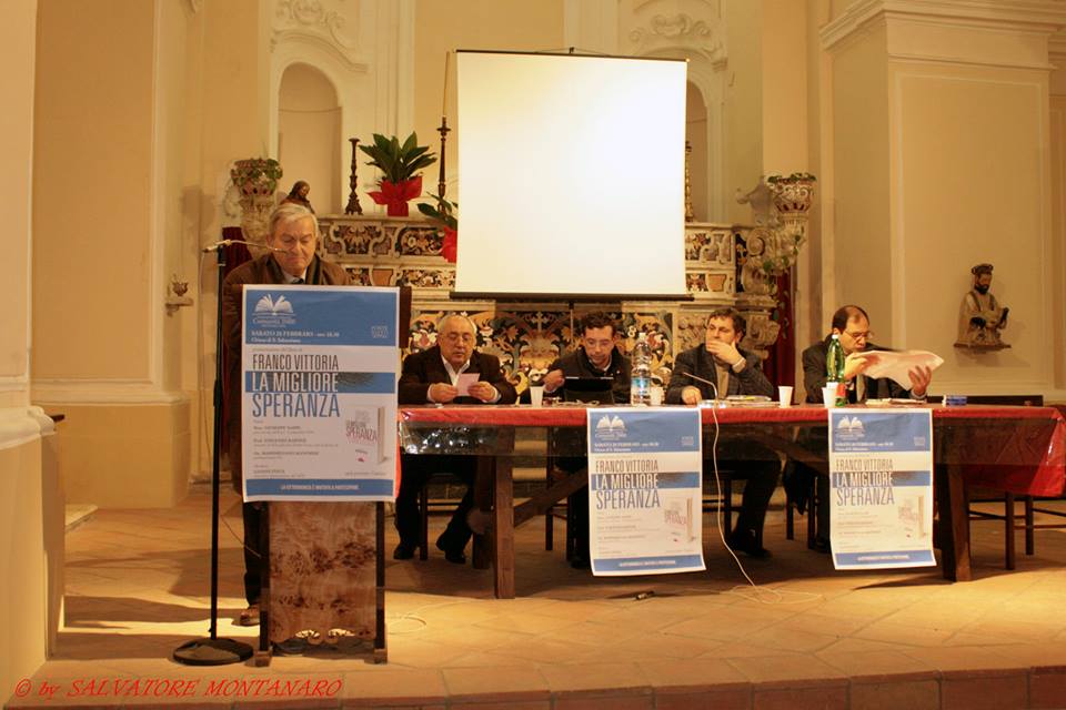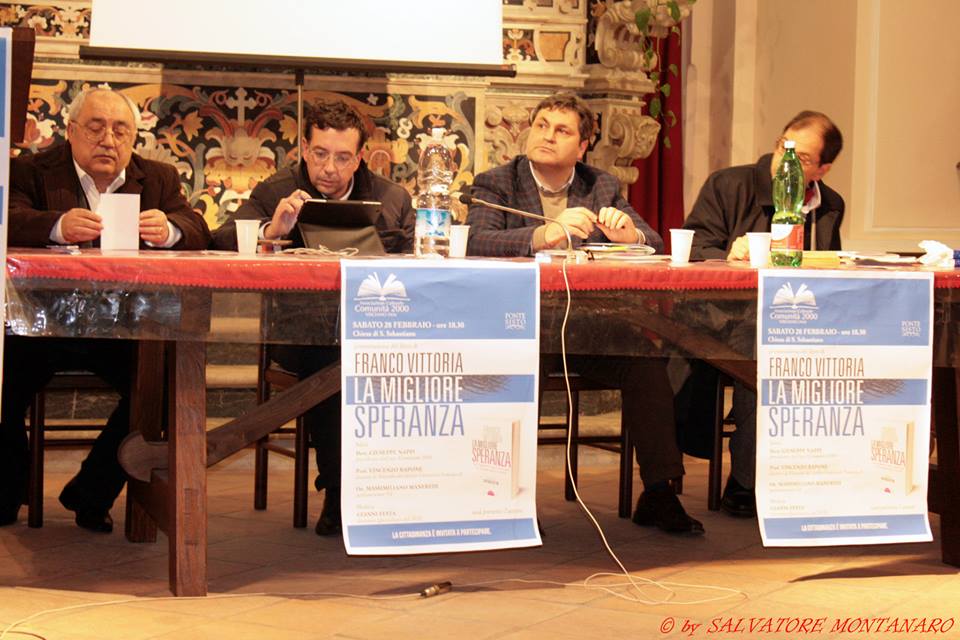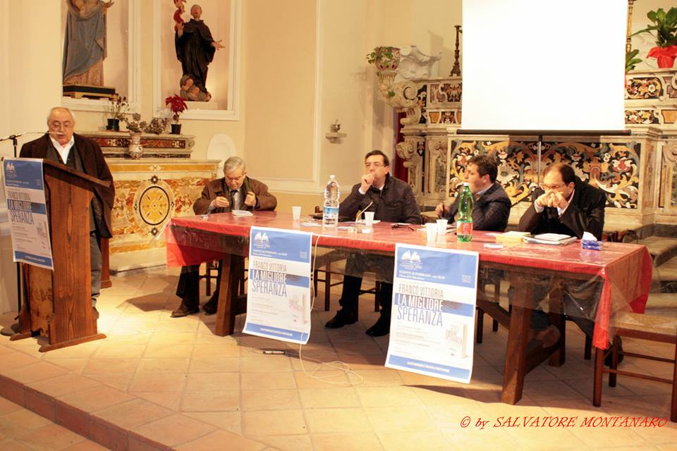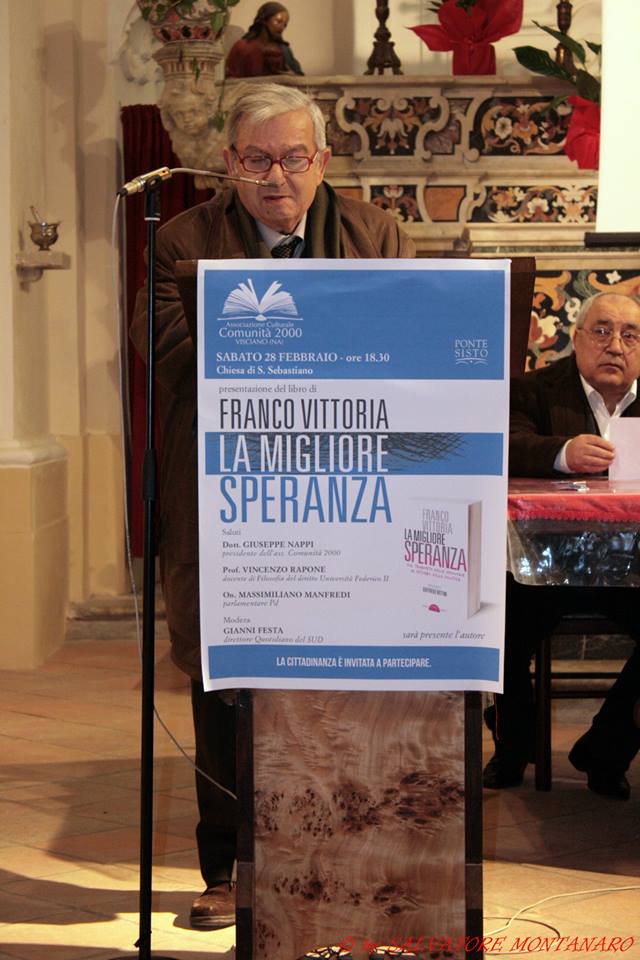 VISCIANO. La migliore Speranza, presentato il libro di Franco Vittoria. FotoPresentato a Visciano il libro di Franco Vittoria con il professor Vincenzo RAPONE della Federico II e il parlamentare del Pd, Massimiliano MANFREDI. Presente per l’occasione il sindaco di Visciano, Pellegrino Gambardella. Evento organizzato da Comunità 222 con il presidente, avv. Giuseppe Paolo Nappi che ha moderato i lavori. Location dell’incontro la monumentale chiesa di San Sebastiano posta nel centro antico del Comune collinare. Vittoria, che è un politico e amministratore di lungo corso ha voluto dire la sua su ideologia nei partiti e l’oggi dove si sceglie al di là dei dogmi. Che é successo dopo il crollo del muro di Berlino in quel 1989 che portò al crollo del Patto di Varsavia. Vittoria da militante del Pd parla dell’oggi. Un pensiero critico verso il partito di appartenenza e delle divisioni interne. Delle Primarie in Campania e di un partito nuovo e non un nuovo partito. Uditorio attento con cittadini e associazioni locali come ANTA e ATAPC, associazione culturale Il Carro e militanti del Pd del Nolano e Basso Avellinese. Nicola Valeri  (Foto di Salvatore Montanaro)