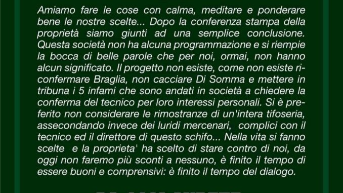 La Curva Sud: Il progetto Avellino non esiste, da oggi non faremo più sconti a nessuno.