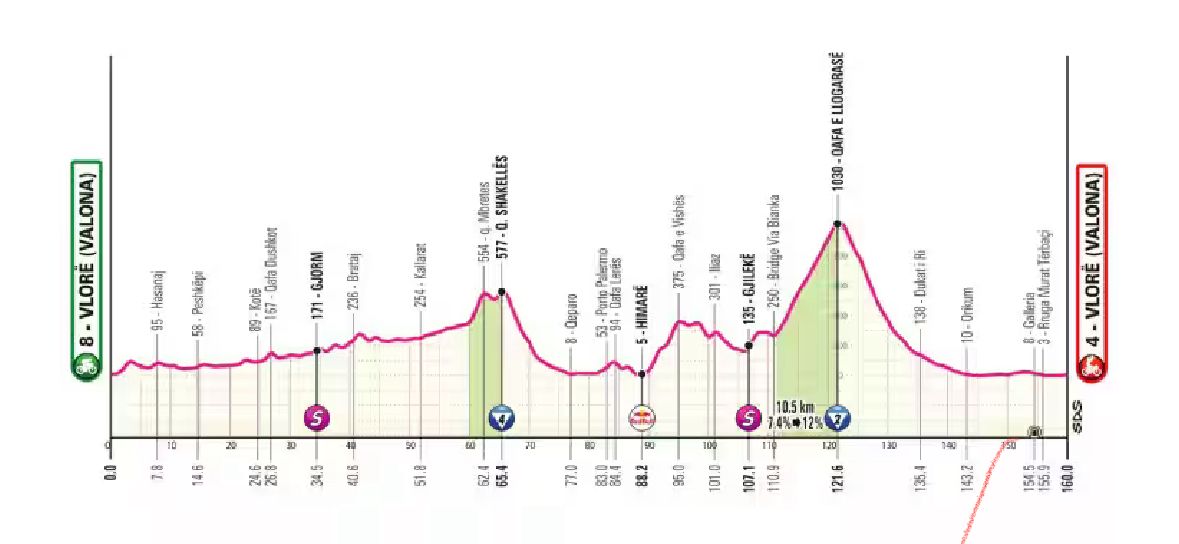 Archiviata la cronometro, la carovana del Giro si prepara alla terza frazione, ultima in territorio albanese. Domenica 11 maggio si correrà la Valona-Valona, 160 chilometri caratterizzati da un percorso nervoso con due salite principali: la prima dopo 60 km verso Q. Shakellës (577 m, GPM di quarta categoria), la seconda ben più impegnativa verso Qafa e Llogarasë (GPM2), con un’ascesa di oltre 10 km e pendenze fino al 12% che porteranno i corridori oltre i 1.000 metri di altitudine.