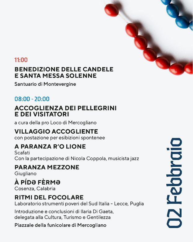 Il primo febbraio ad alternarsi saranno spazi di confronto e musica con “Tutt’ se fa pe’ te, Mamma Schiavona”, in programma, alle 17.30, alla chiesa San Francesco di Mercogliano, si terrà una conferenza musicata con fra Fedele Mattera e Francesco Lepore. Alle 18,30, presso la sede di Avionica, “A lume di Candelora” dialogo con Carolina Vesce, docente di antropologia culturale all’Università di Messina.