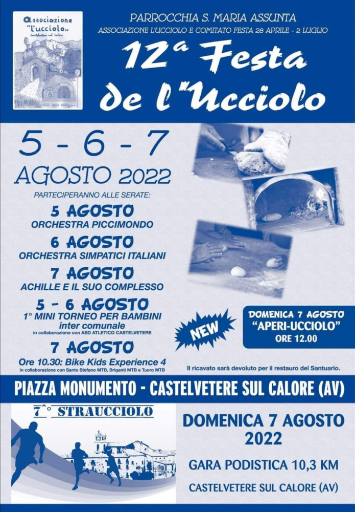 Tre giorni programmati nel calendario estivo di uno dei borghi caratteristici della provincia di Avellino, pensati per rievocare i gesti e le fattezze di un rituale collettivo. A partire da venerdì 5 agosto, la musica è protagonista con l’Orchestra Piccimondo, poi sabato 6 con l’Orchestra Simpatici Italiani e, infine, domenica 7 con Achille e il suo complesso. Location della manifestazione la piazza, luogo antropologicamente preposto al sentimento di condivisione e di adunanza popolare. Nell’agorà principale di Castelvetere sono stati già installati cinque forni a legna per la cottura dell’Ucciolo, prodotto con gli ingredienti poveri della cucina, quali farina, acqua, sale e lievito, e conditi con salumi locali e con verdure del territorio. Un’iniziativa che unisce tutta la comunità per una buona causa: il ricavato dell’evento è destinato al restauro della statua di Maria Santissima delle Grazie. In occasione della tre giorni, il CAI – Centro Alpino Italiano di Avellino sarà presente con una proposta di sport montano, la parete di arrampicata. Invece, per i più piccoli, venerdì 5 e sabato 6 si apre il I Torneo per bambini inter comunale in collaborazione con ASD Atletico Castelveterese e alle 10.30 di domenica 7, attesa la quarta edizione di Bike Kids experience e a seguire L’aperiucciolo. Gran finale con la VII edizione della Straucciolo, la gara podistica di 10,3 chilometri per le strade del paese.