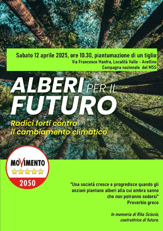 Il consigliere comunale Antonio Aquino, in collaborazione con il gruppo territoriale di Avellino del Movimento 5 Stelle, è lieto di annunciare l’iniziativa “Alberi per il Futuro”, che si terrà sabato 12 aprile alle ore 10.30 presso via Francesco Manfra, località Valle.