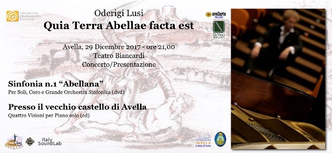 La settimana successiva il maestro pianista compositore avellano Oderigi Lusi, il 29 dicembre presso il Teatro-Auditorium Biancardi alle ore 19.00, presenterà al pubblico il DvD dell’opera “Sinfonia Abellana”. Le meravigliose immagini sono state girate nel settembre 2014 presso l’antico anfiteatro durante il gran concerto con l’Orchestra Filarmonica Campana in occasione di “ClanioinArte”.Lusi eseguirà in prima assoluta una riduzione pianistica del IV e V Movimento della Sinfonia e le quattro visioni per piano solo “Presso il Vecchio Castello di Avella”.Quest’ultima è la sua seconda opera dedicata alla sua città natale. Durante la serata saranno disponibili la partitura edita da OMK-Da Vinci Edition, il cd, e il cd in versione cartoncino deluxe fatto a mano ad opera di Bibelot Arte .