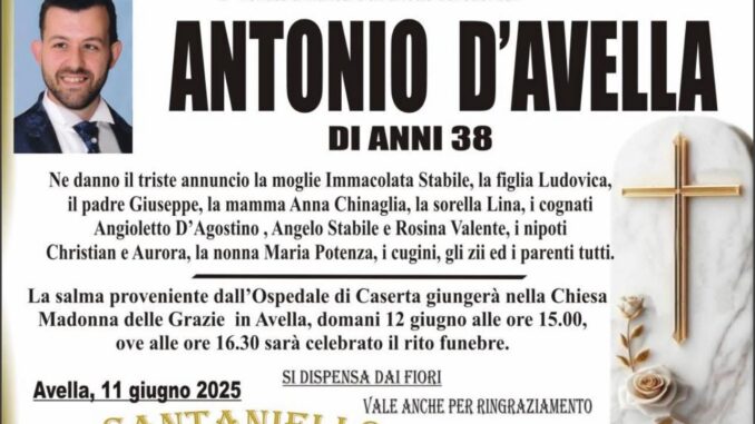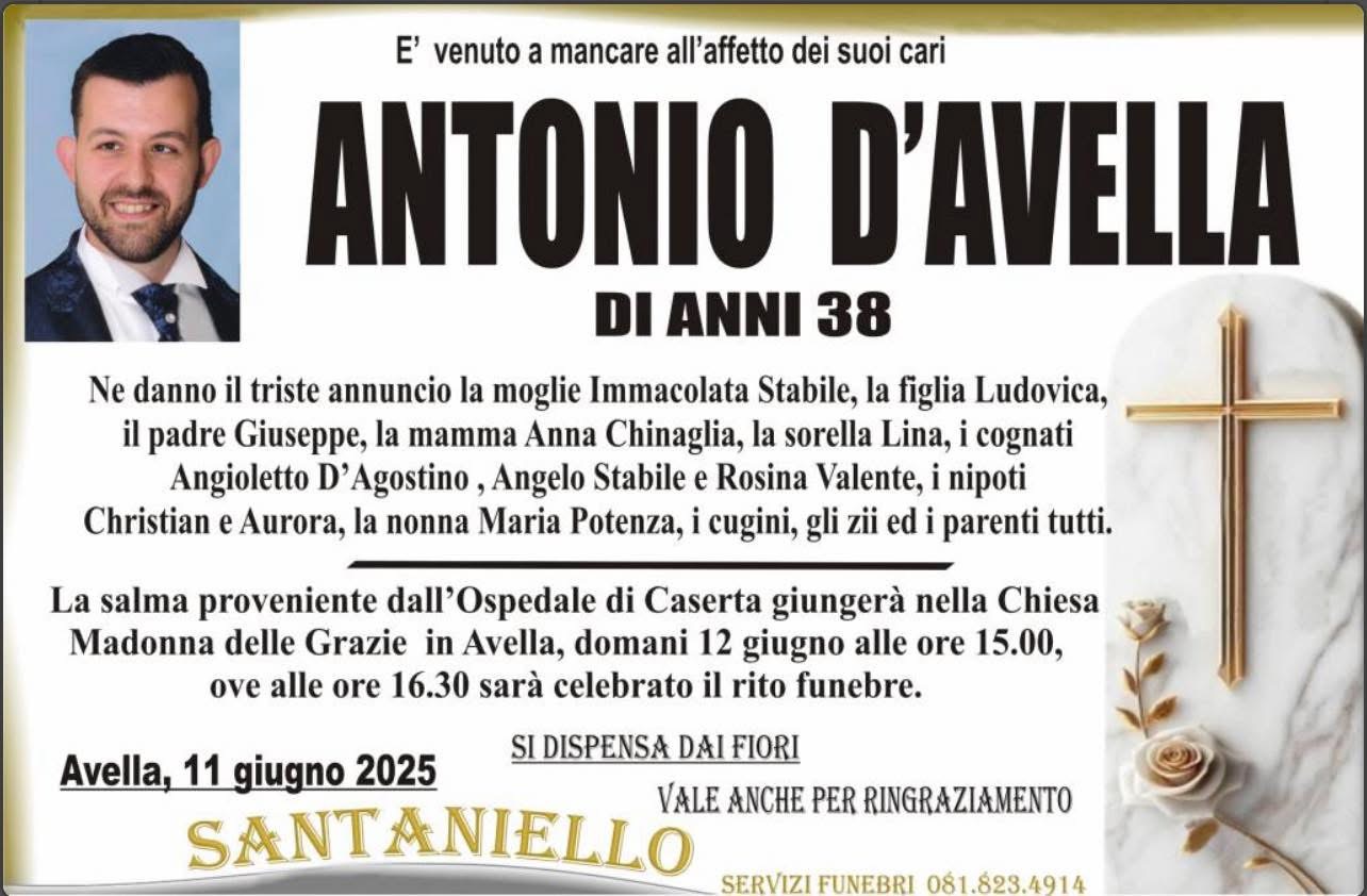 Avella (AV), 11 giugno 2025 – La comunità di Avella è profondamente scossa per la prematura scomparsa di Antonio D’Avella, venuto a mancare all’età di soli 38 anni. A darne il triste annuncio sono la moglie Immacolata Stabile, la figlia Ludovica, il padre Giuseppe, la madre Anna Chinaglia, la sorella Lina, i cognati Angioletto D’Agostino, Angelo Stabile e Rosina Valente, i nipoti Christian e Aurora, la nonna Maria Potenza, oltre ai cugini, agli zii e a tutti i parenti.