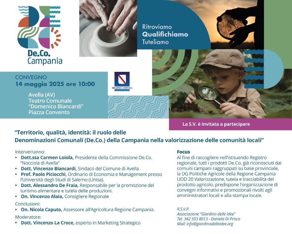 Mercoledì, 14 maggio 2025, alle ore 10:00, ad Avella (AV), presso il Teatro Comunale “Domenico Biancardi”, sito in Piazza Convento, avrà luogo il convegno sul tema: “Territorio, qualità, identità: il ruolo delle Denominazioni Comunali (De.Co.) della Campania nella valorizzazione delle comunità locali”, l’iniziativa è organizzata dall’Associazione culturale “Giardino delle Idee”, in collaborazione con la DG Politiche Agricole della Regione Campania UOD 20 Valorizzazione, tutela e tracciabilità del prodotto agricolo.