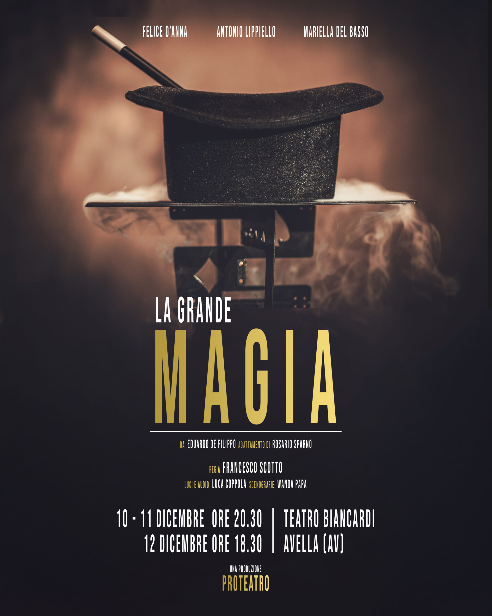 E’ di notevole caratura culturale, l’approccio, con cui la Compagnia di Proteatro affronta e si misura, per la prima volta, con la drammaturgia di Eduardo De Filippo, mettendo in scena La Grande magia, alla luce dell’adattamento del testo fatto da Rosario Sparno, avvalendosi del consenso di giudizio critico espresso da Luca De Filippo. Un approccio che è saluto e impegno; in primo luogo, vuole essere ed è un garbato saluto di gradimento e di aperta fiducia verso la normalità, che, con il supporto delle campagne vaccinali e la matura responsabilità della società civile, viene ricomponendosi per gradi e in sicurezza, dopo le restrizioni e lockdown del tempo sospeso determinato dalle criticità emergenziali della Sars-CoV-2.