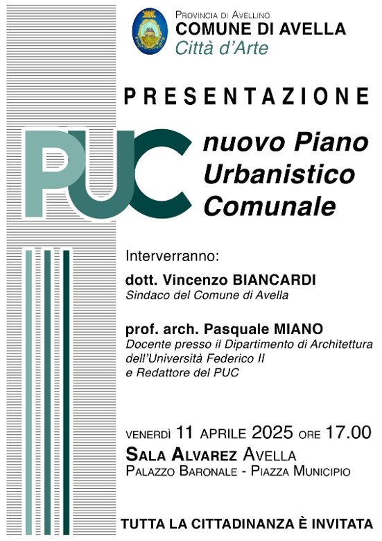 Il Sindaco Vincenzo Biancardi e l’Amministrazione Comunale di Avella invitano la cittadinanza alla presentazione del nuovo Piano Urbanistico Comunale (PUC) venerdì 11 aprile 2025, ore 17:00 – Sala Alvarez.