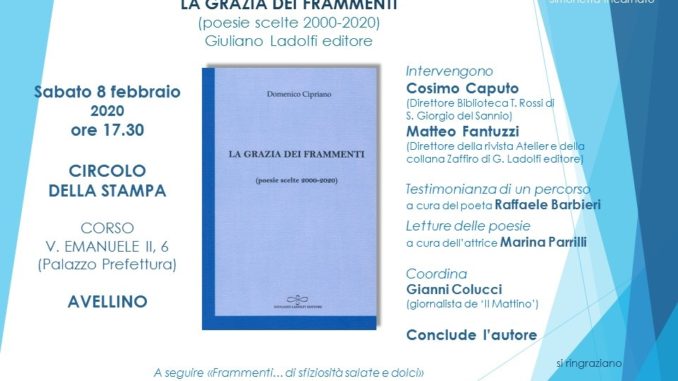 Si presenta sabato 8 febbraio alle ore 17,30 ad Avellino presso il Circolo della Stampa, in Corso Vittorio Emanuele, n. 6, il nuovo libro di Domenico Cipriano che ha per titolo “La grazia dei frammenti (poesie scelte 2000-2020)”, un’antologia ragionata delle sue poesie a 20 anni dal primo libro, che esce per le edizioni Giuliano Ladolfi.